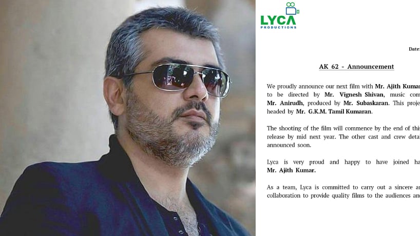 விக்னேஷ் சிவன் இயக்கத்தில், அஜித் நடிக்கும் 'AK 62' படத்தின் அதிகாரப்பூர்வ அறிவிப்பை வெளியிட்டது லைகா நிறுவனம்.
